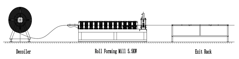 Decoiler→Guide Feeding→Roll Forming System→AUTO Post Saw Cutter Device→Exit Rack